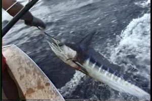 During the winter months in Kona, Striped Marlin show up in good numbers and it’s not uncommon to catch multiple fish on your full or half day Hawaii fishing charter.  Striped Marlin don’t get as big as their cousin the Blue Marlin,  but they can put up a good fight and a great show jumping and making fast long runs.  This little Striped Marlin puts on a good shows and never stops jumping all the way up to the boat.  For more information on booking your Hawaii Fishing Charter on the Humdinger, call Captain Jeff Fay today at (800) 926-2374.