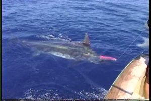 Kona Fishing ReportJohn Wilson of Placerville California caught this nice blue marlin estimated at 500 lbs on his first Hawaii fishing charter in Kona Hawaii. The marlin exploded onto the short bait and put up a spectacular fight, taking line and jumping several times during the fight. Captain Jeff Fay navigated the Humdinger perfectly, allowing deck hand Henry “Butch” Chee to bring the big fish along side for clean tag and release.